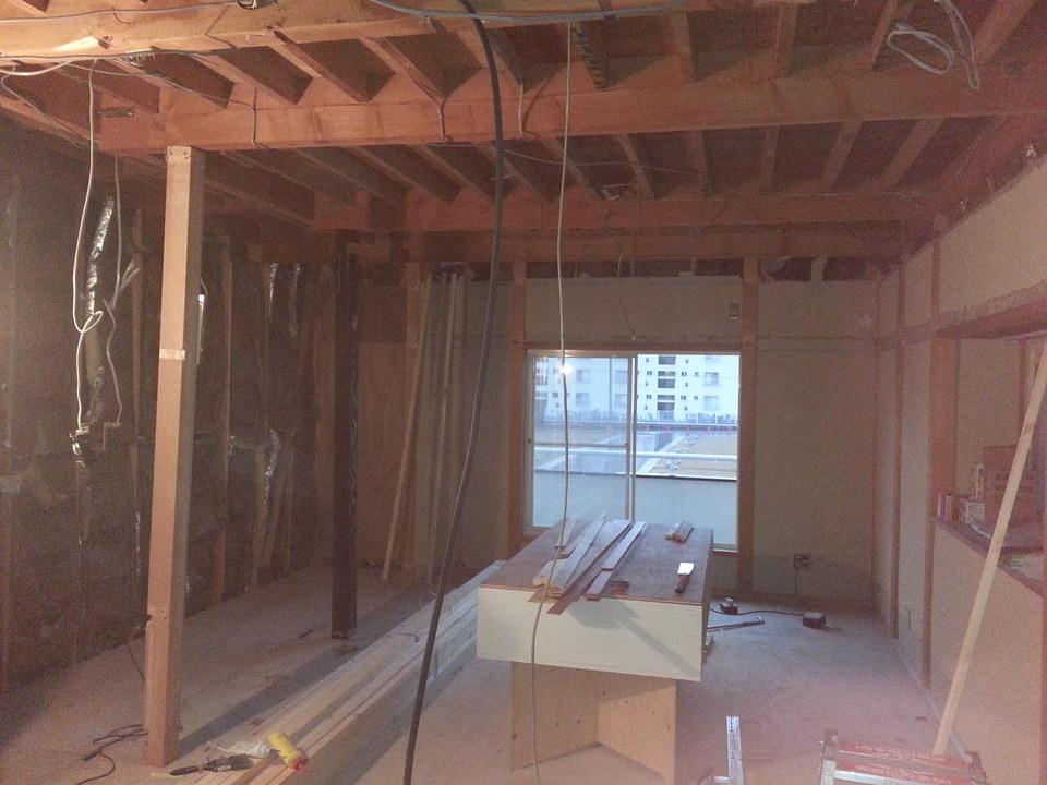 3F部分の床を切り抜いて、吹き抜けにし、2F部分をもともと和室とキッチンダイニングの2部屋に区切られていたのを1部屋の広いLDKに変身させました。